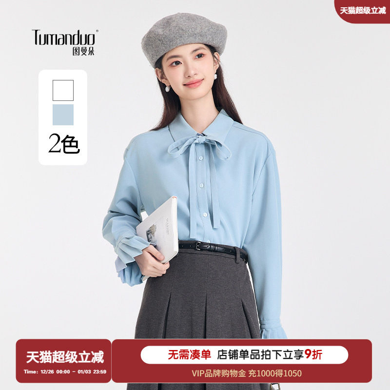 时尚蝴蝶结雪纺衬衫女MOFAN摩凡2025冬新款白色喇叭袖设计感衬衣