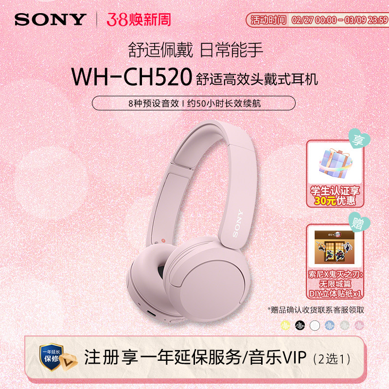 【自营】Sony/索尼WH-CH520头戴式线蓝牙耳机立体声舒适佩戴国行