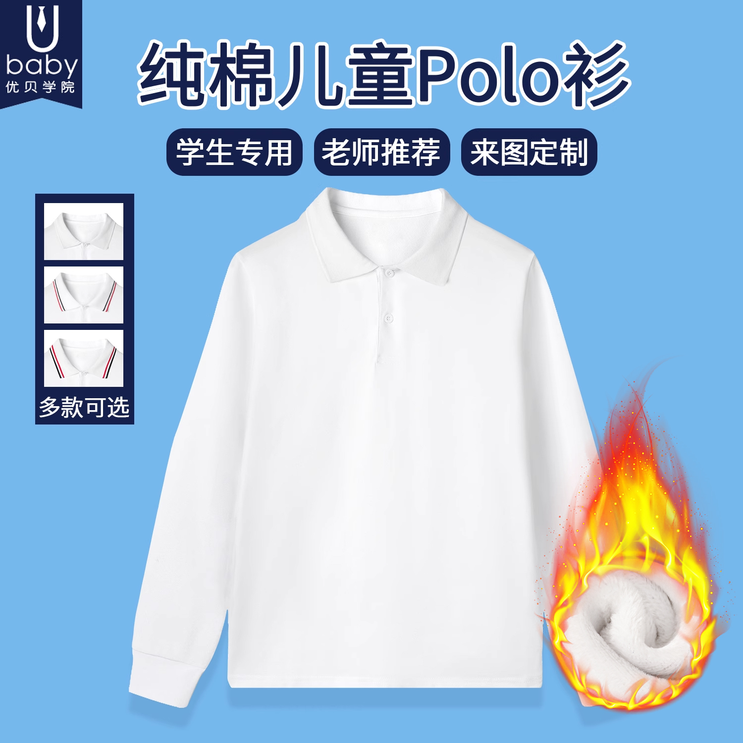 男童加绒Polo衫加厚T恤白色学生校服女童打底衫保暖冬季儿童长袖