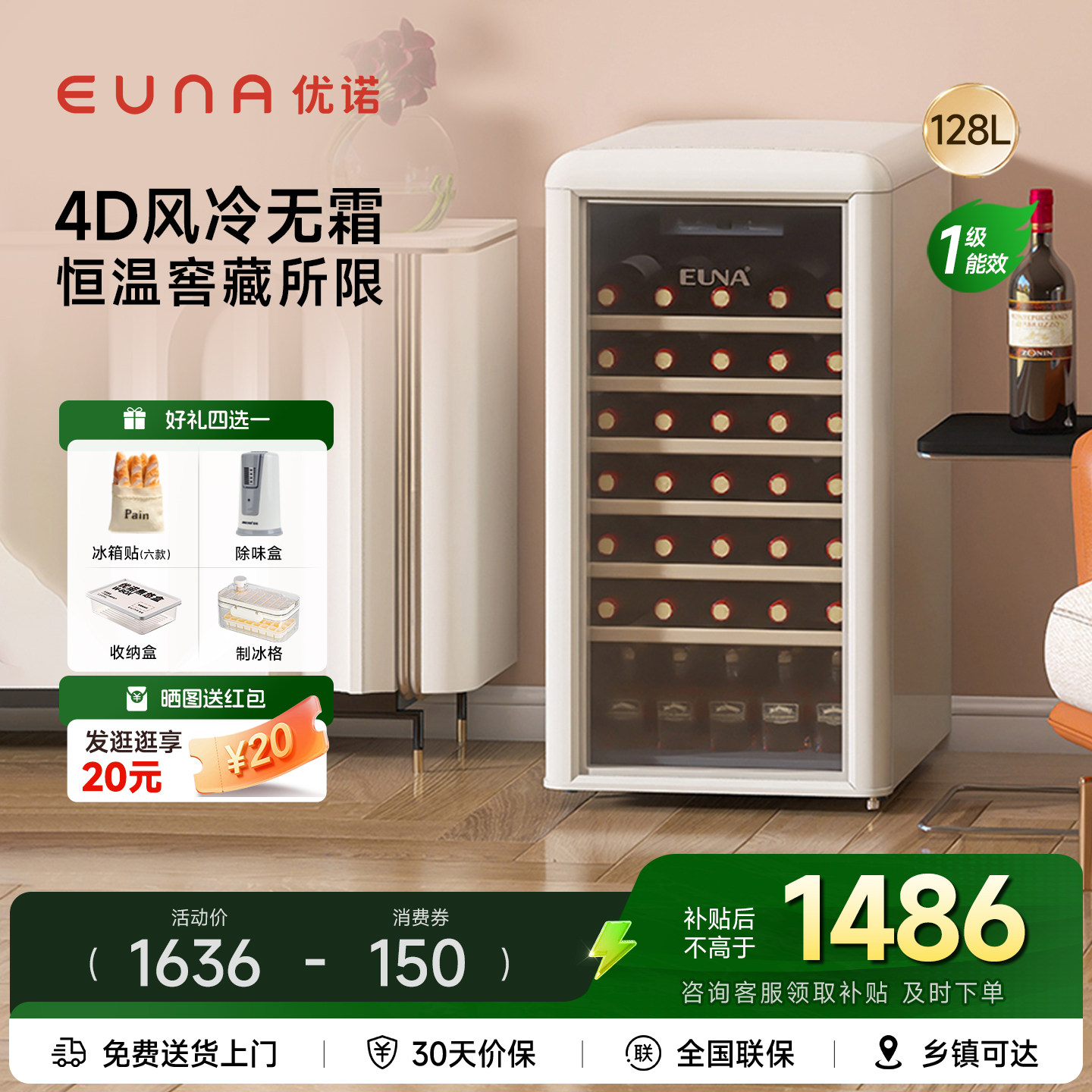 EUNA/优诺JCS-128WR复古红酒柜风冷恒温柜家用嵌入式小型冰吧冰箱