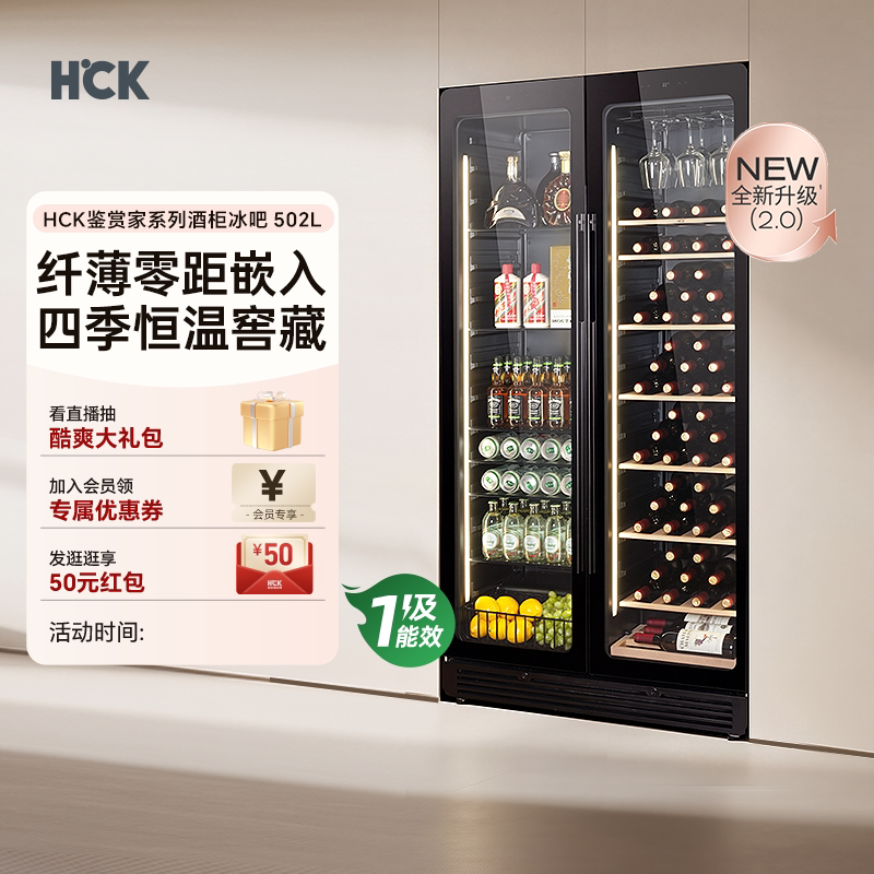 HCK哈士奇高端红酒柜恒温客厅家用冰吧嵌入式超薄双门双温展示柜