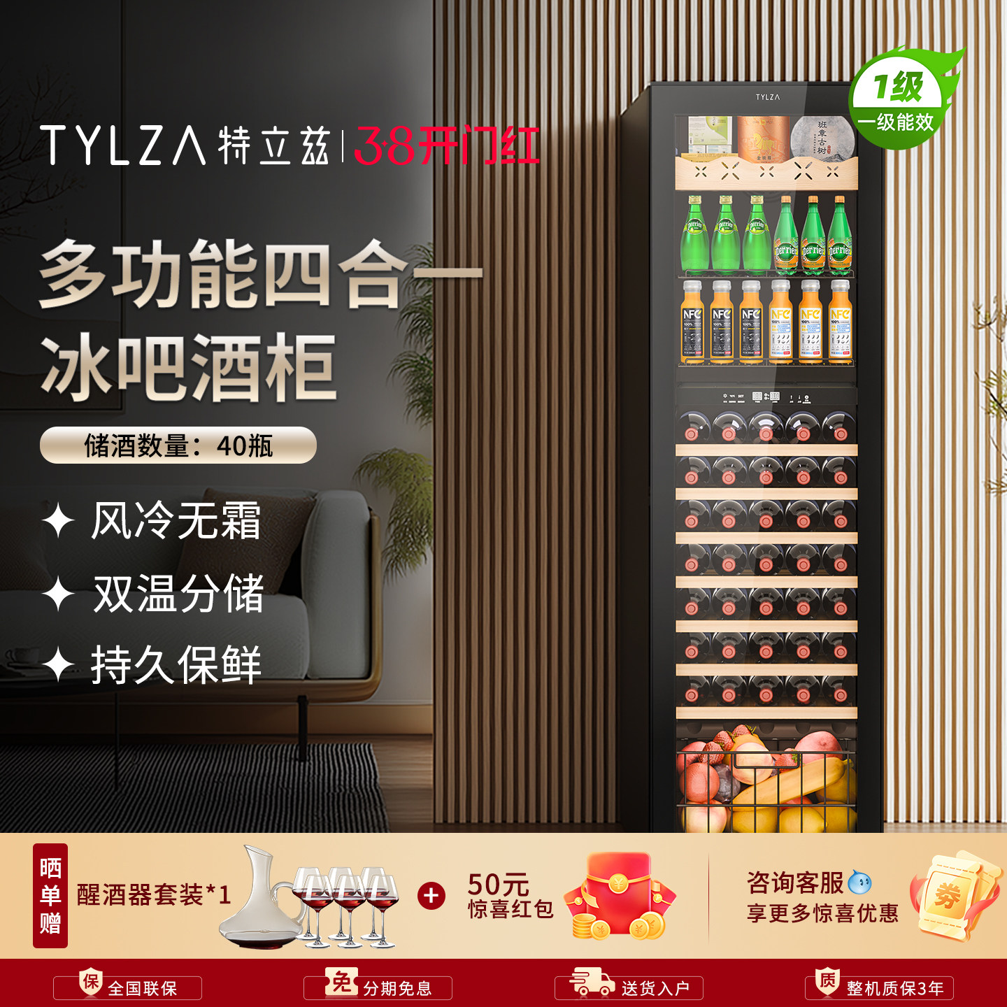 TYLZA恒温红酒柜家用客厅冷藏保鲜风冷无霜双温冰吧茶叶柜TW208