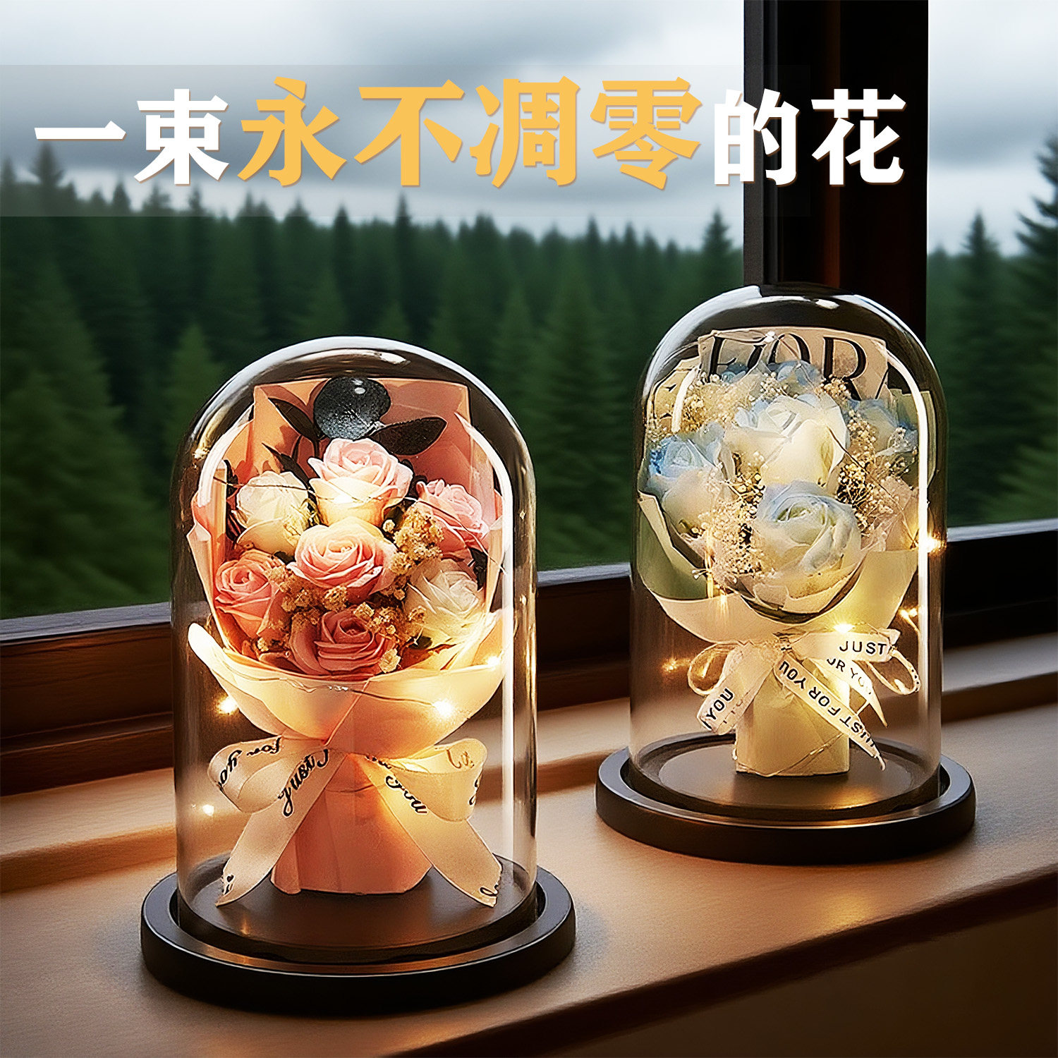 七夕情人节玻璃罩永生花束摆件女生日礼物玫瑰花高级创意礼品好物