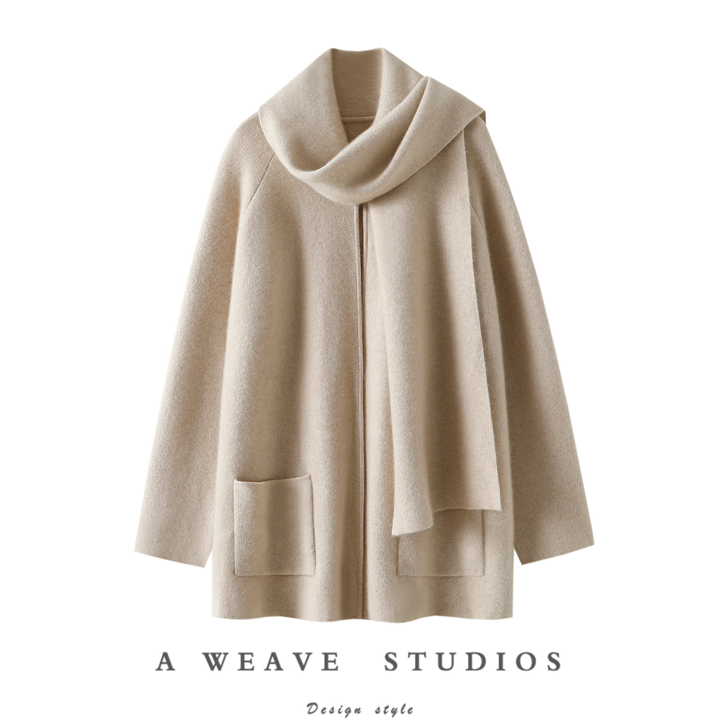 高定富家气场!加厚100%山羊绒开衫女纯羊绒毛衣连围巾中长款外套