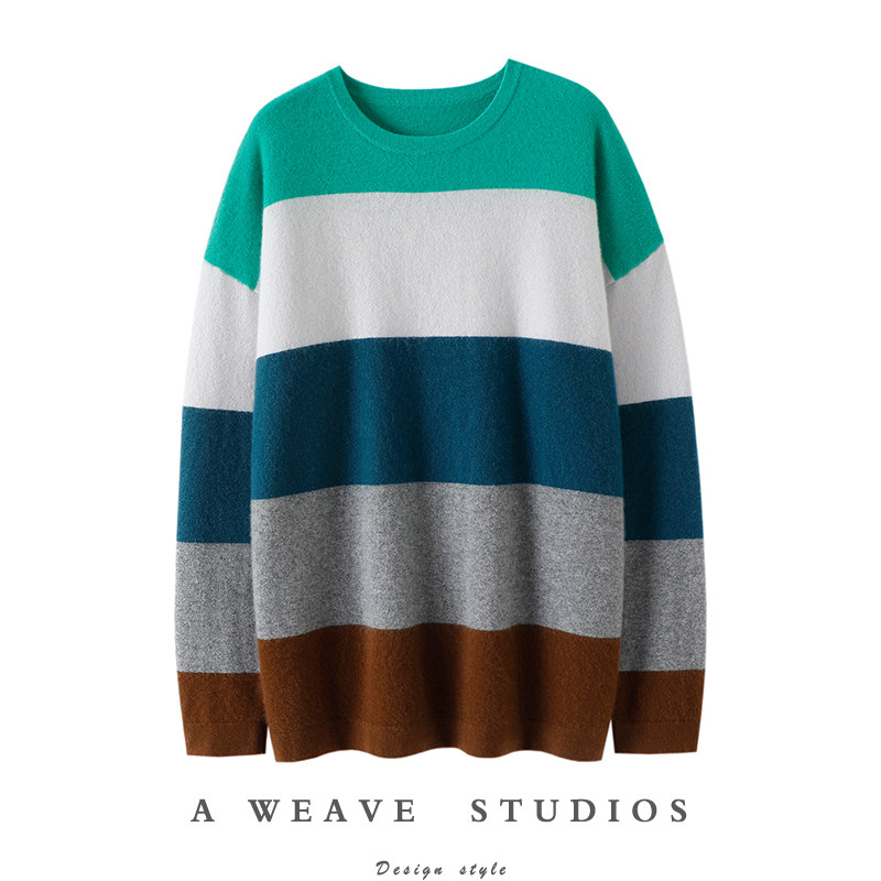 千金小松弛~条纹圆领100%纯山羊绒衫女中长款纯羊绒毛衣慵懒风