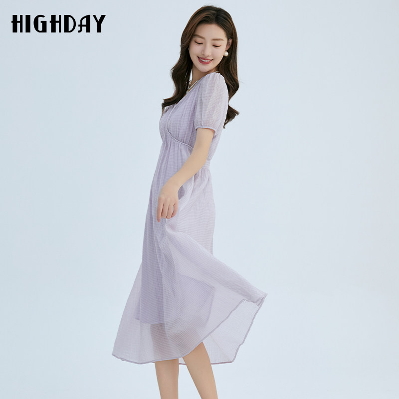 轩日2024夏装商场款V领温柔香芋紫女裙新款高腰显瘦泡泡袖连衣裙
