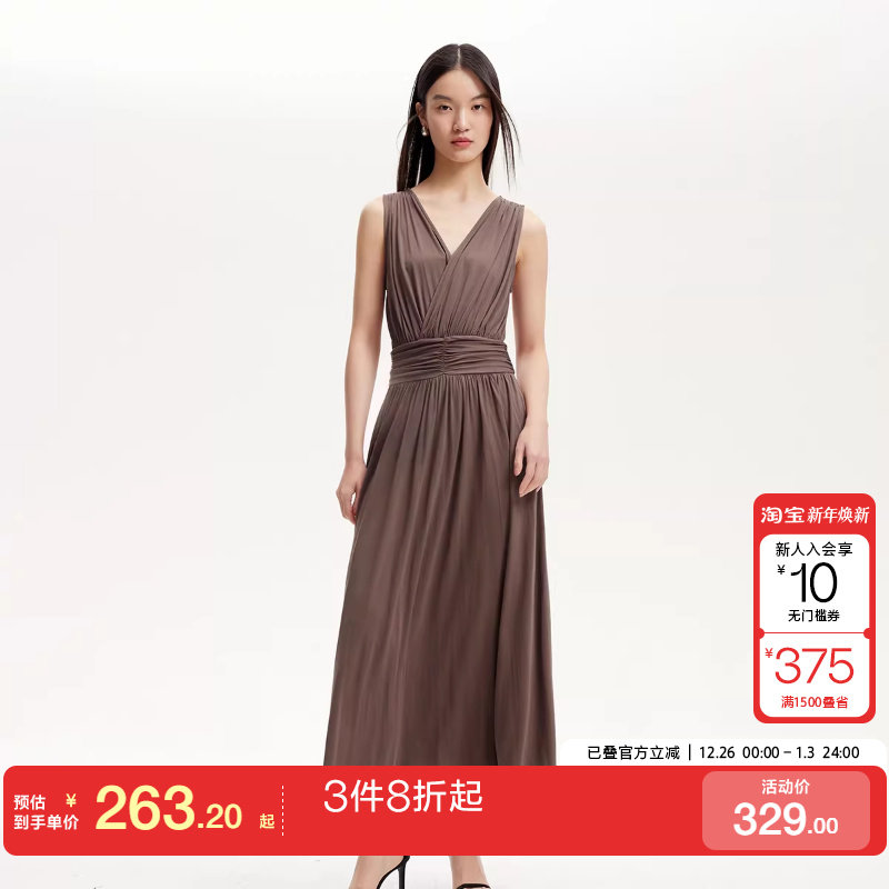 vq区绫致Vero Moda连衣裙女25夏季大V领褶皱高腰无袖显瘦连衣裙