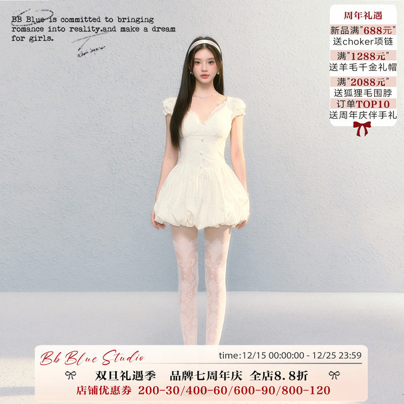 BB BLUE/初恋泡芙/法式纯欲气质高腰收腰小白裙V领短袖夏季连衣裙