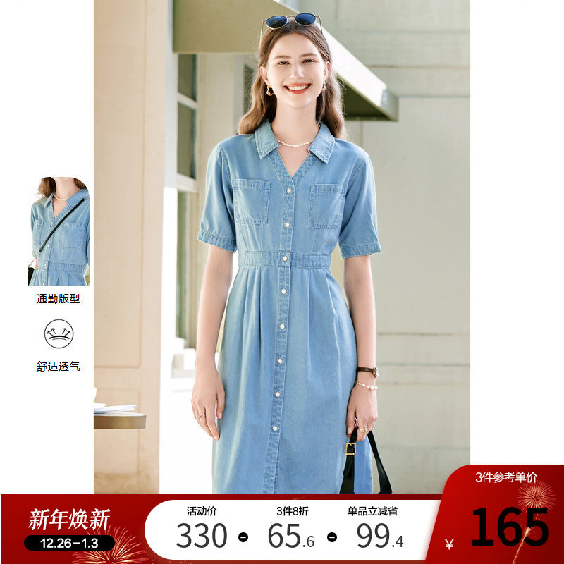 betu百图女装2024年夏季新款V领高腰显瘦短袖牛仔蓝色连衣裙子