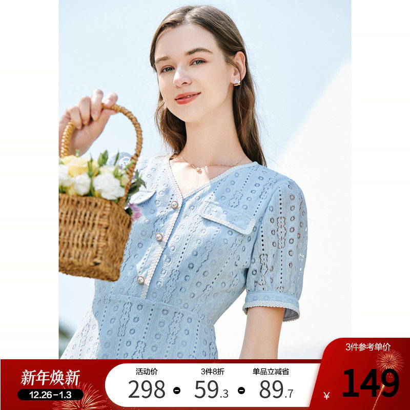 betu百图女装2024年夏季新款高腰镂空显瘦通勤V领短袖连衣裙子