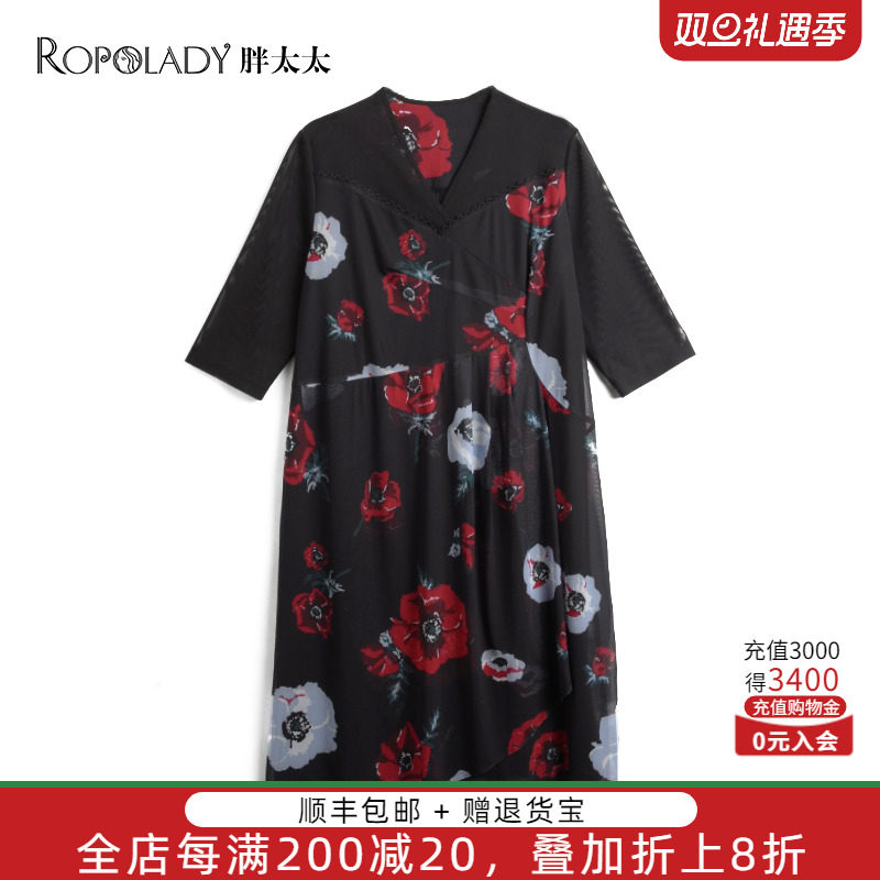 胖太太大码女装夏季新款韩版高腰网纱中长款连衣裙V领潮720107541