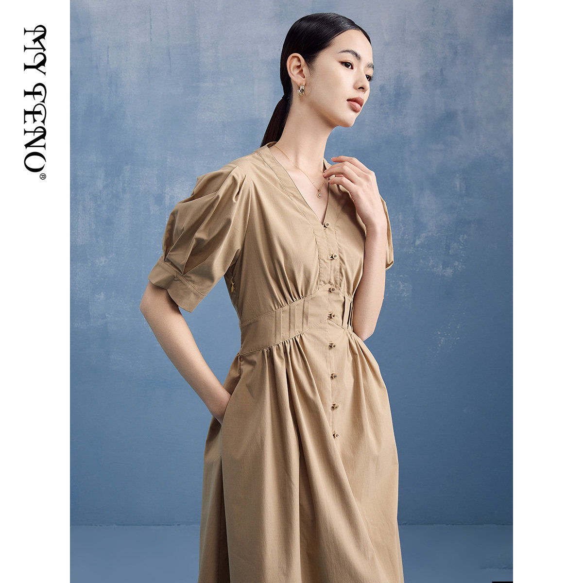 马天奴春夏新款女卡其色V领泡泡袖高腰连衣裙子收腰短袖气质法式