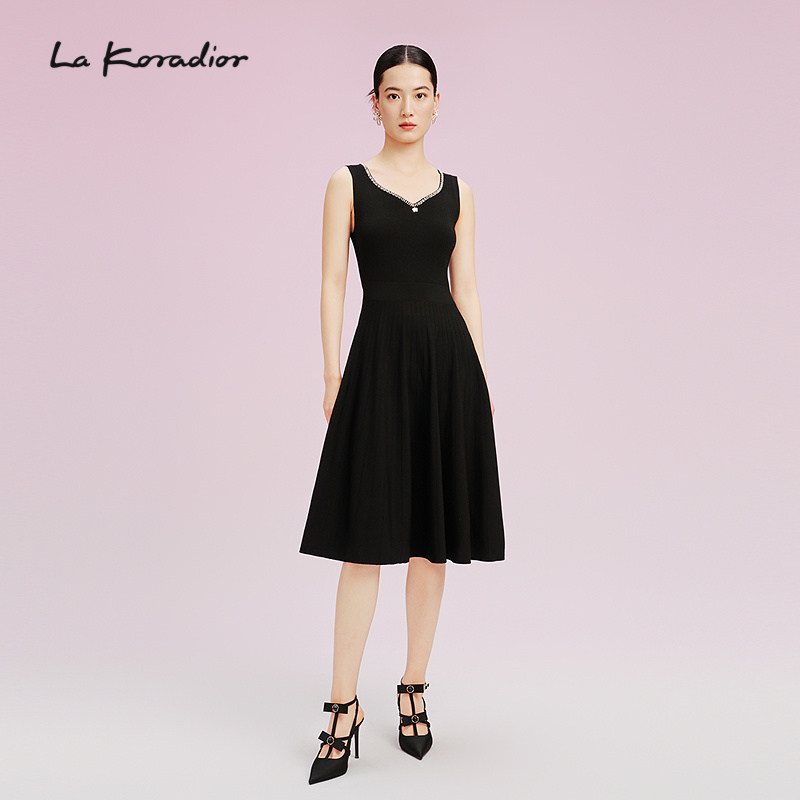 La koradior拉珂蒂气质无袖V领黑色连衣裙女2025夏季新款高腰裙
