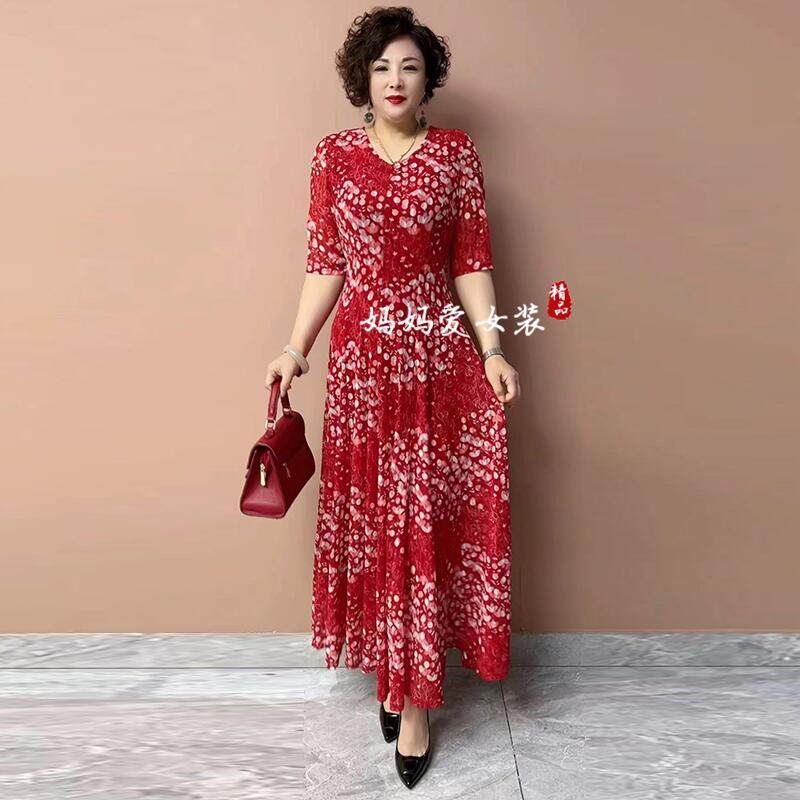气质妈妈连衣裙夏新款中袖50岁高弹V领显瘦高腰十片不断腰大摆裙