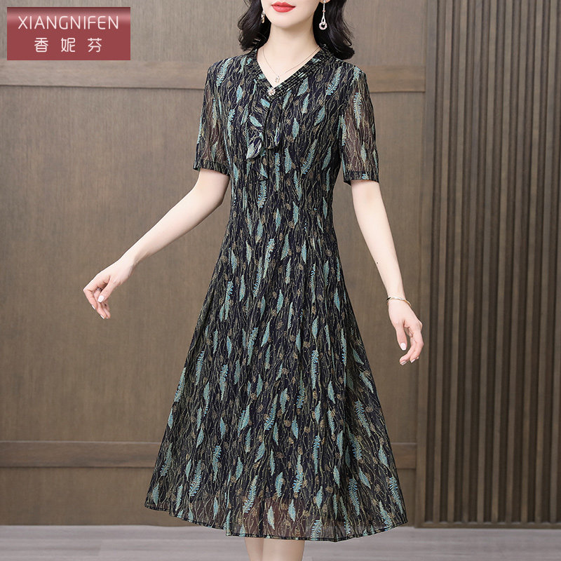 香妮芬2025夏季新款气质妈妈v领网纱连衣裙时尚优雅女士高腰显瘦