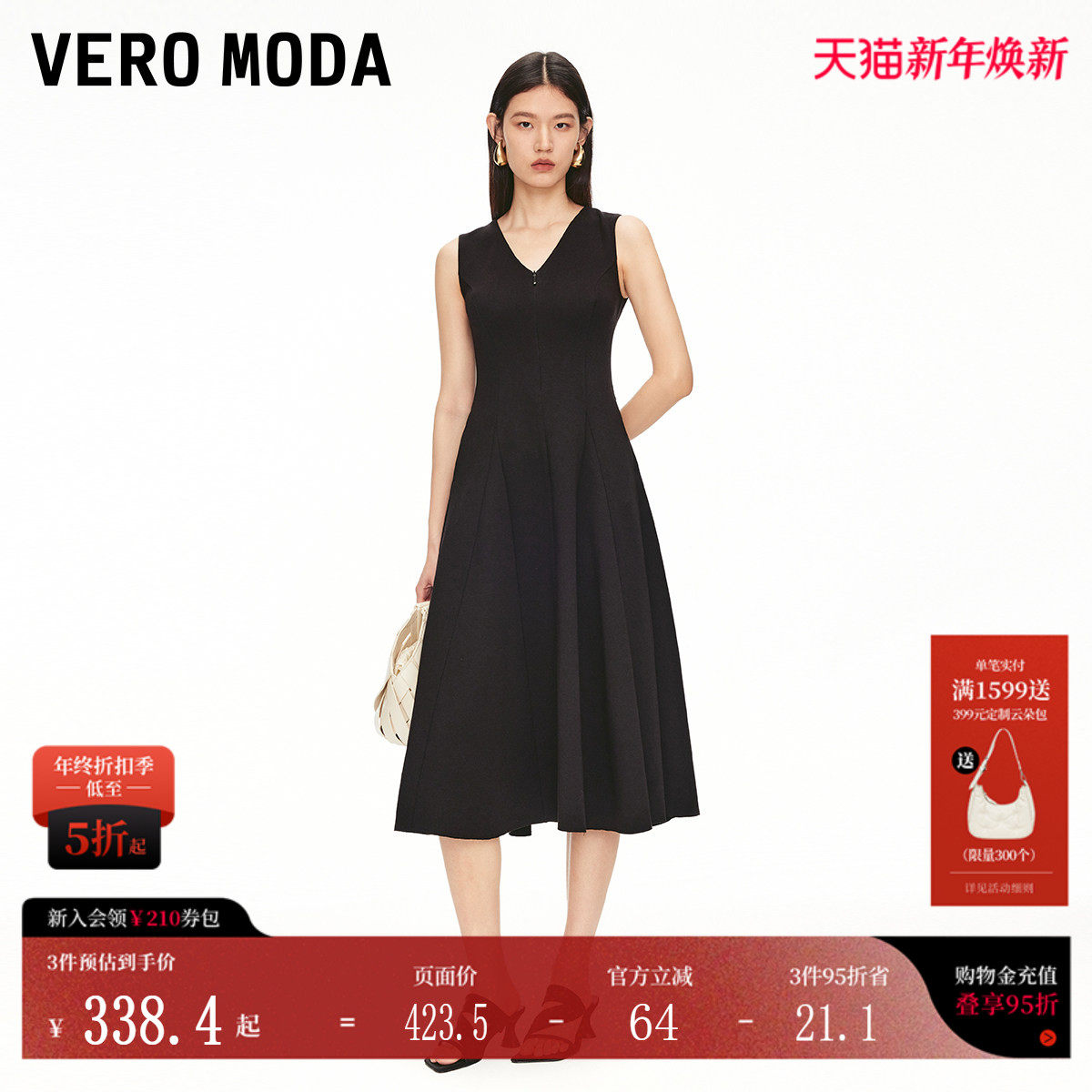 Vero Moda连衣裙女2025夏季新款大V领褶皱A版高腰无袖显瘦连衣裙
