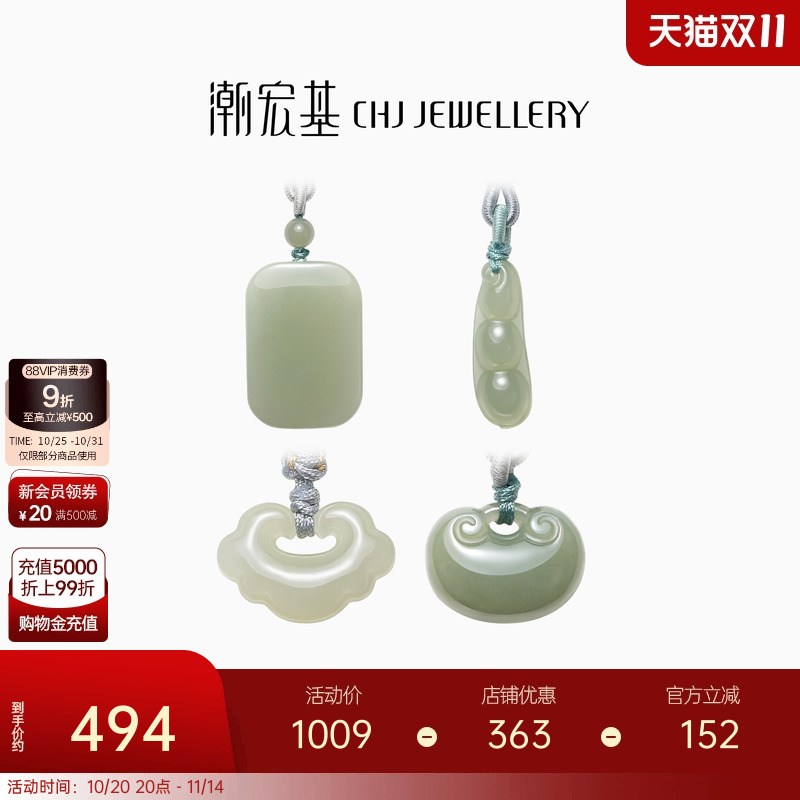 潮宏基倾玉和田玉项链玉石坠链颈饰无事牌中式国风礼物送女友妈妈