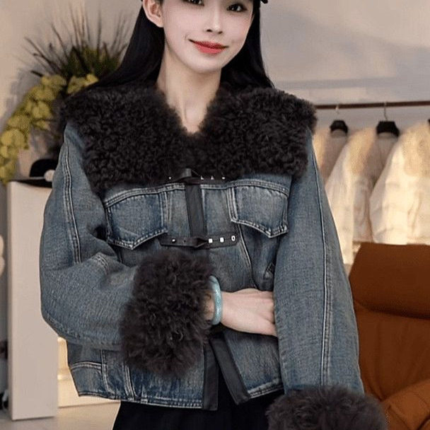 欧货2025秋冬新款短款海军领皮毛一体复古牛仔派克服女皮草外套潮