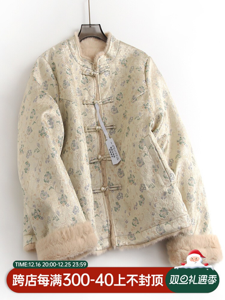 双面穿新中式国风提花宽松加厚保暖立领盘扣唐装女皮草外套H266
