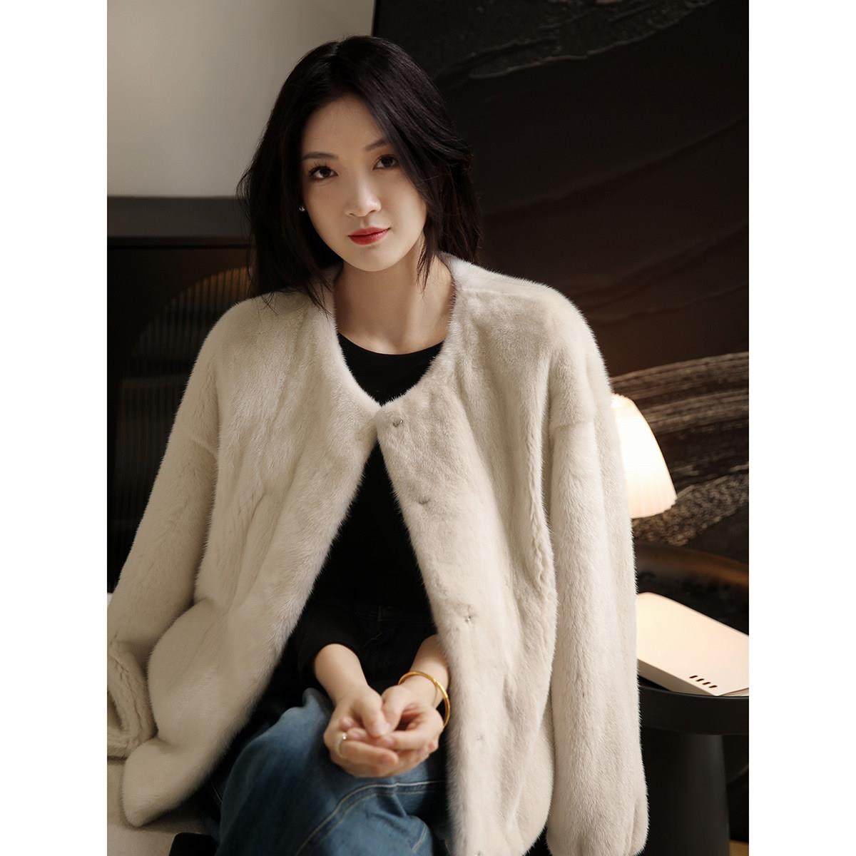 2025秋冬款水貂绒外套女宽松加厚皮草毛毛外套女皮草一体短款圆领