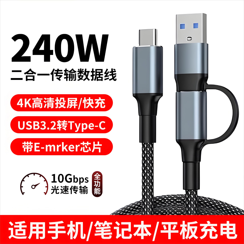 手机数据线240W二合一超级快充适用苹果华为安卓平板手机充电线