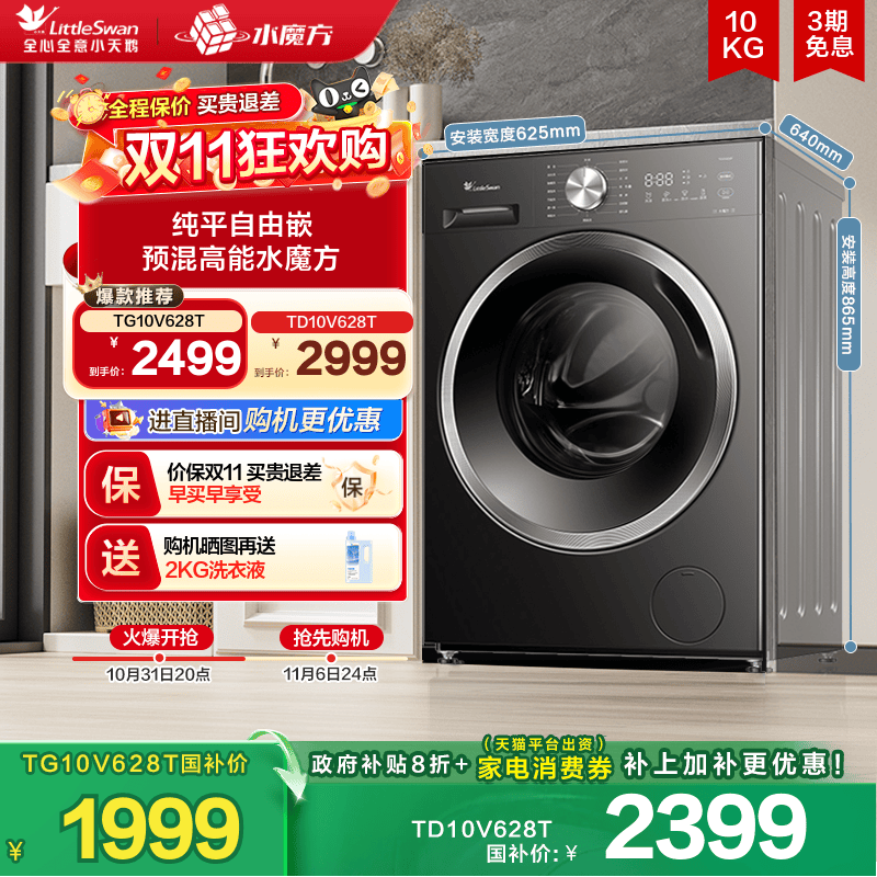 [纯平自由嵌]小天鹅水魔方洗衣机10KG全自动家用滚筒洗脱一体628T