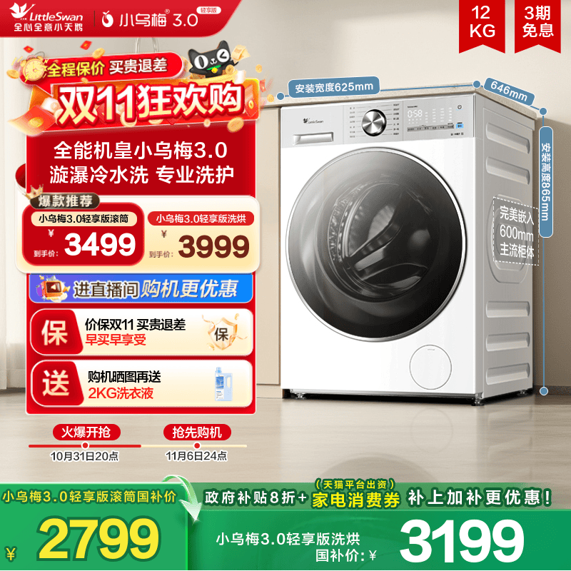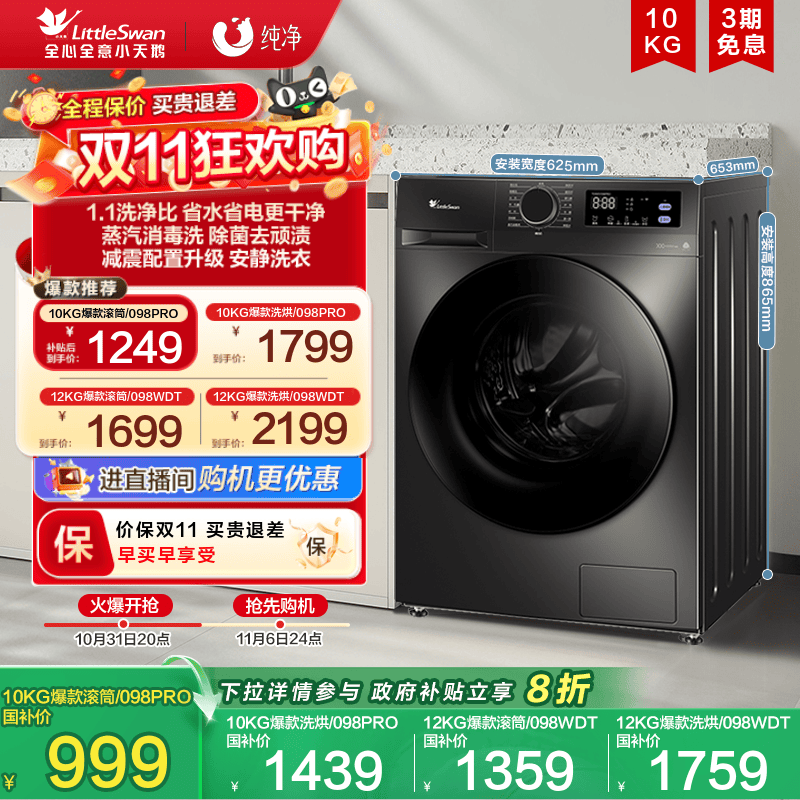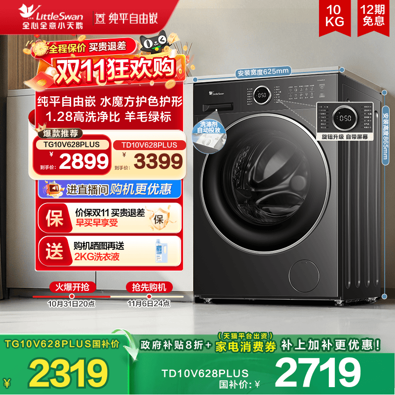 [纯平全嵌]小天鹅小乌梅小钢炮3.0滚筒洗衣机10KG全自动洗烘旗舰