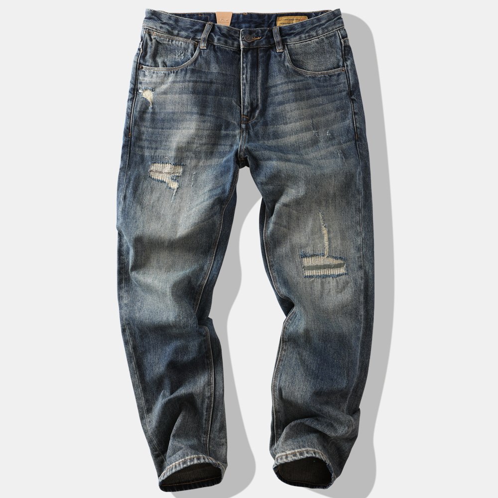 日系复古街潮贴布破洞牛仔裤男水洗做旧直筒宽松春秋裤子纯棉赤耳
