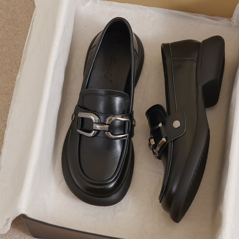 羊皮版~高跟乐福鞋女2025新款加绒粗跟单鞋英伦风小皮鞋大码女鞋
