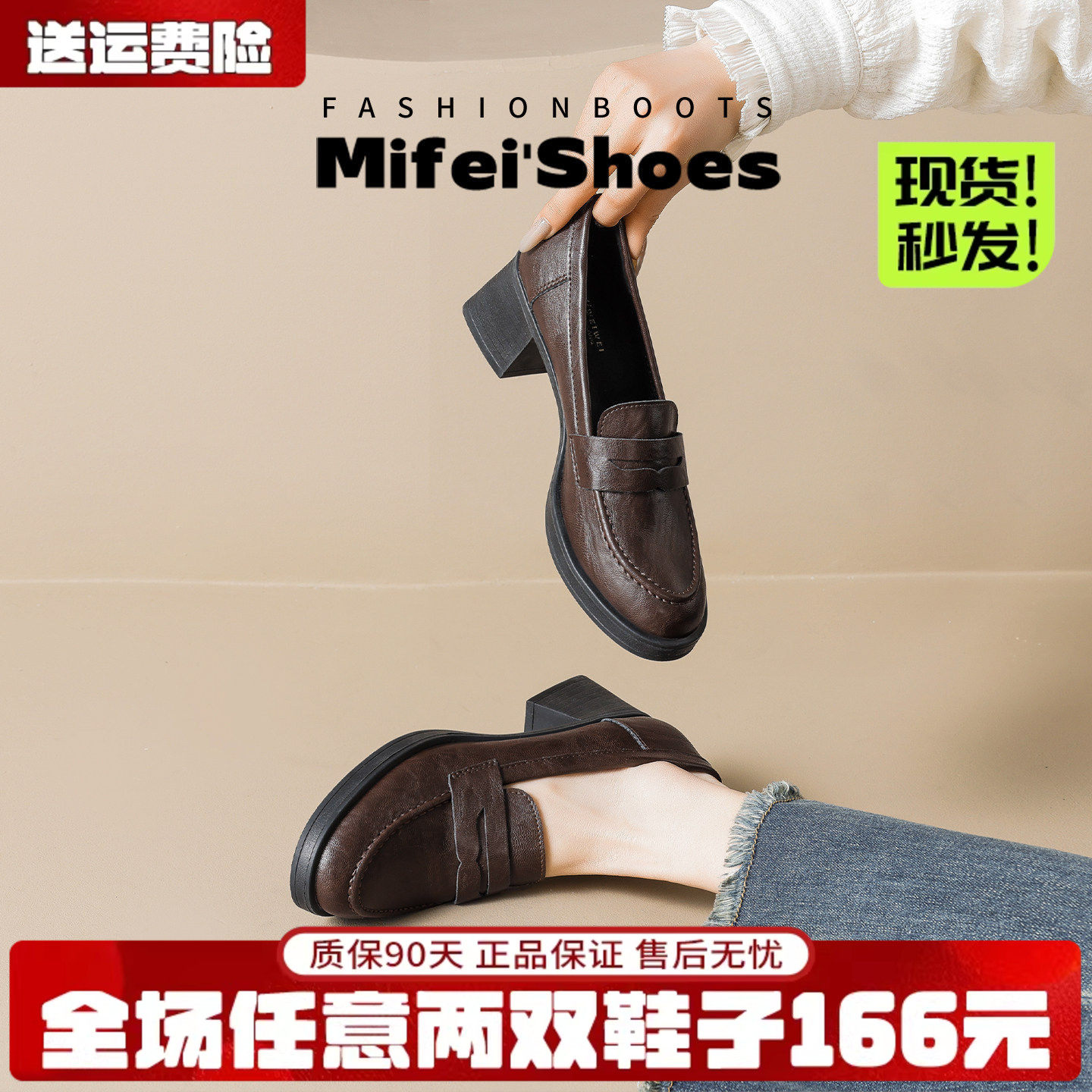 羊皮版~通勤粗跟乐福鞋女黑色中跟单鞋棕色英伦风小皮鞋大码女鞋