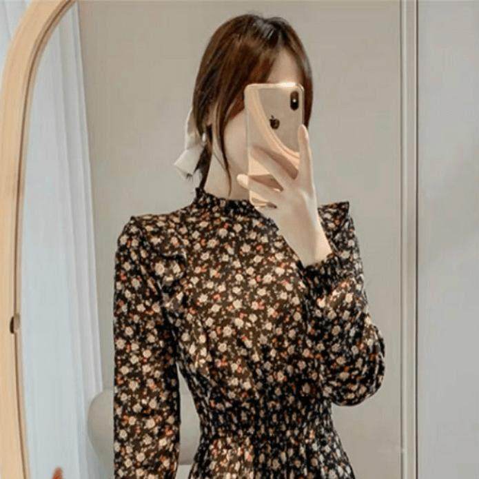 夏休闲法式复古雪纺碎花连衣裙女秋冬季新款小个子收腰显瘦小黑裙