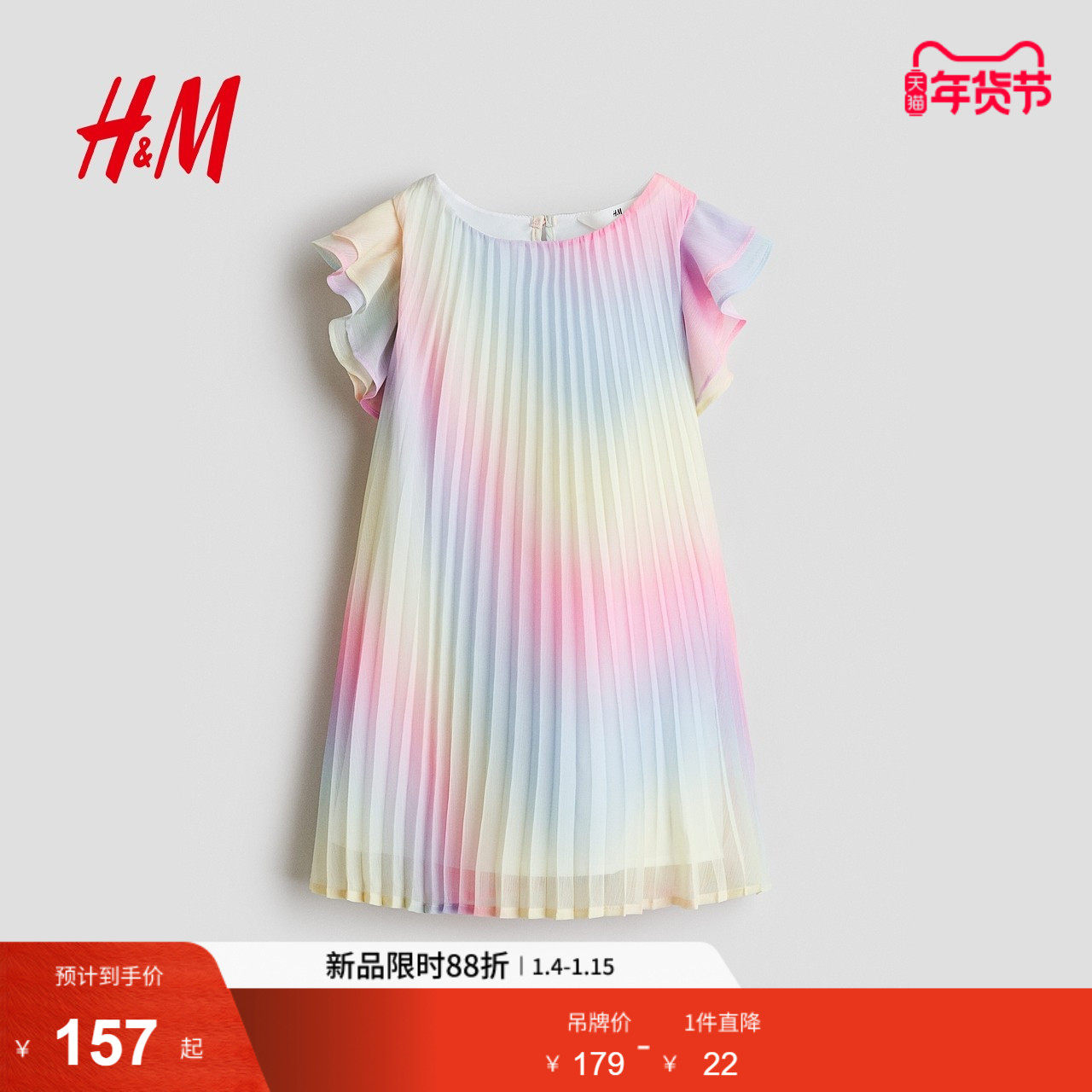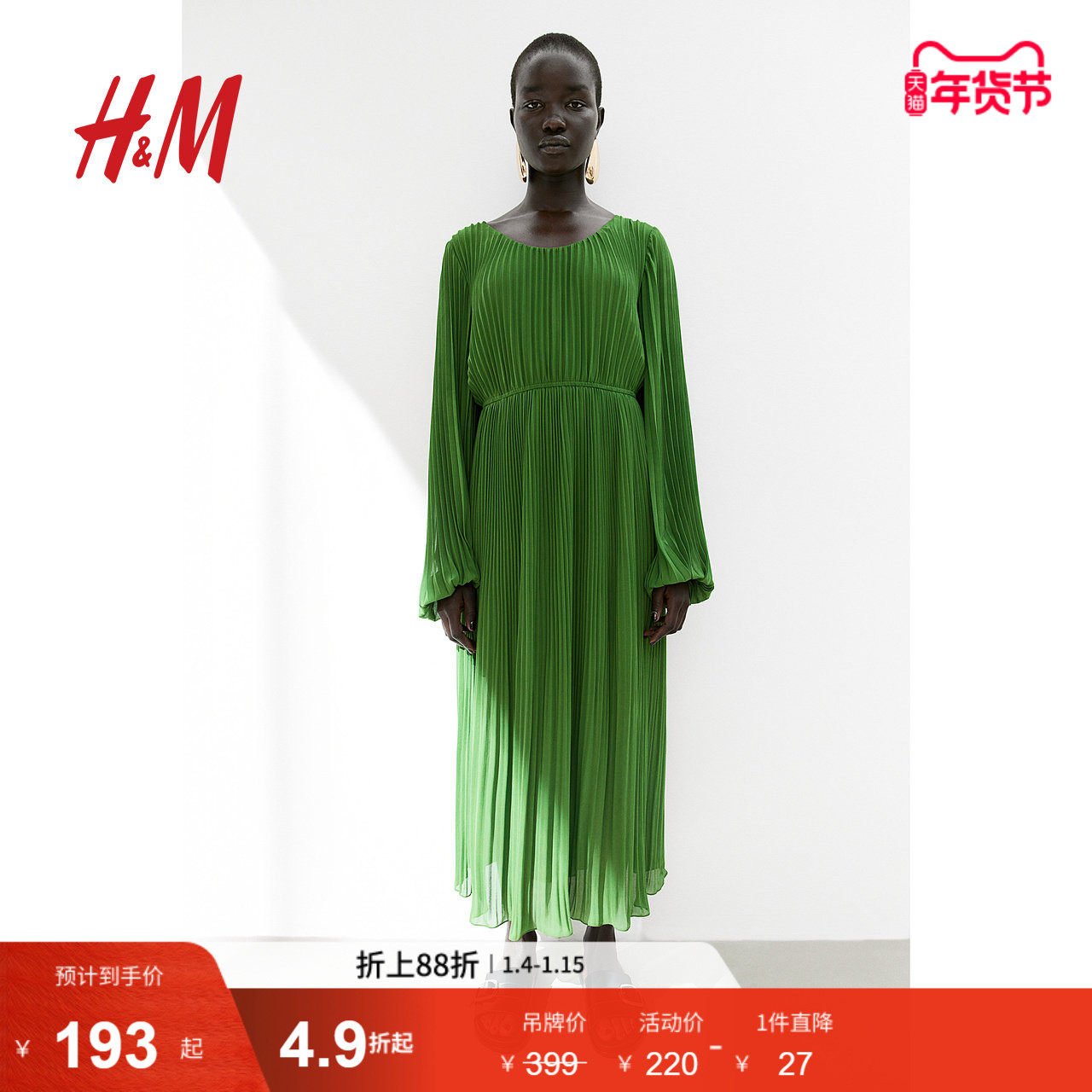 HM女装连衣裙冬季女士简约褶裥喇叭袖雪纺连衣裙1236794
