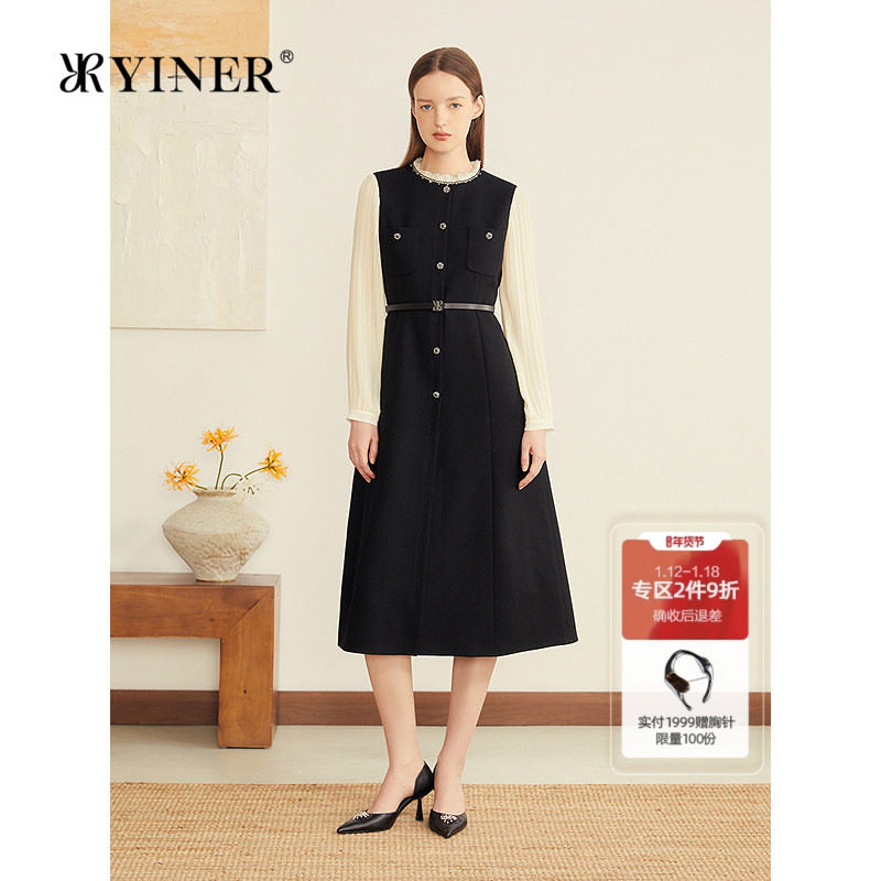 YINER音儿专选2025冬季新款羊毛混纺拼接雪纺袖钉珠撞色连衣裙