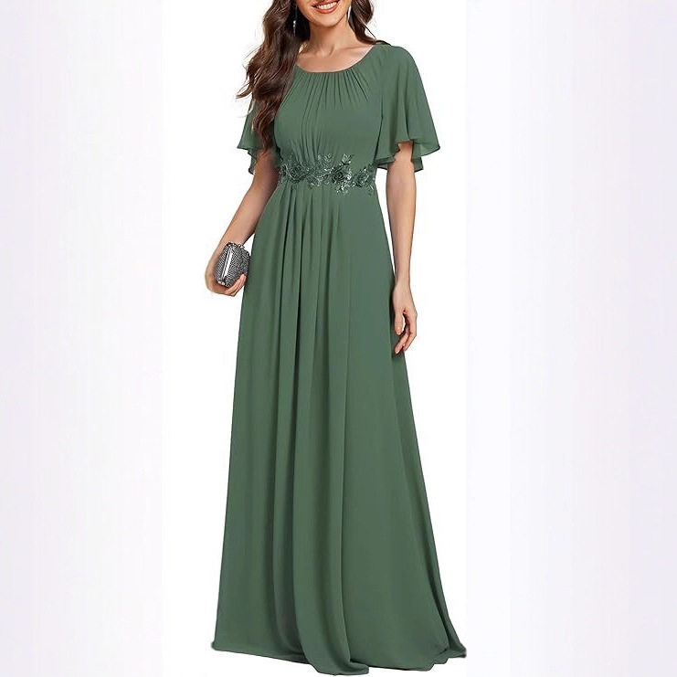 欧美礼服2026新款冬季V领喇叭袖连衣裙弹性雪纺宴会伴娘大码礼服