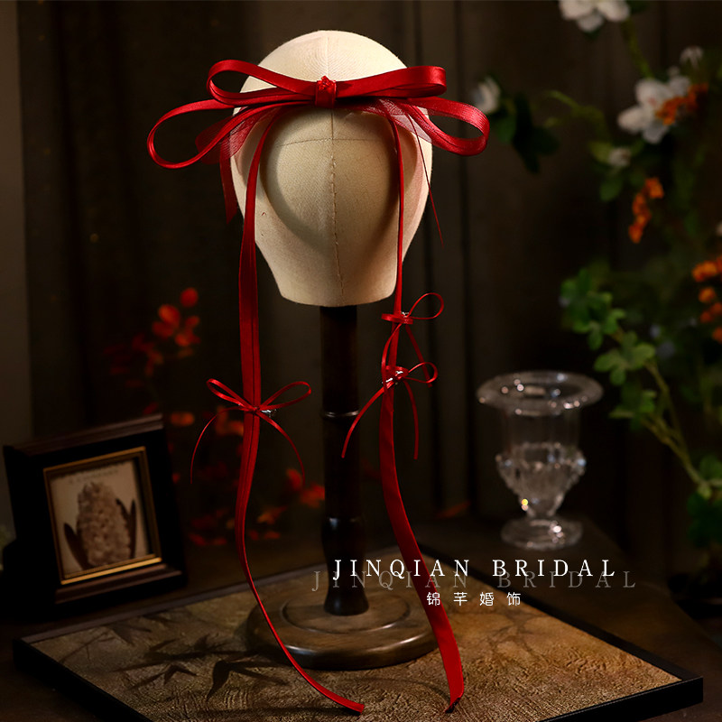锦芊新款超仙酒红色蝴蝶结飘带发夹结婚晨袍敬酒服新娘头饰发饰品