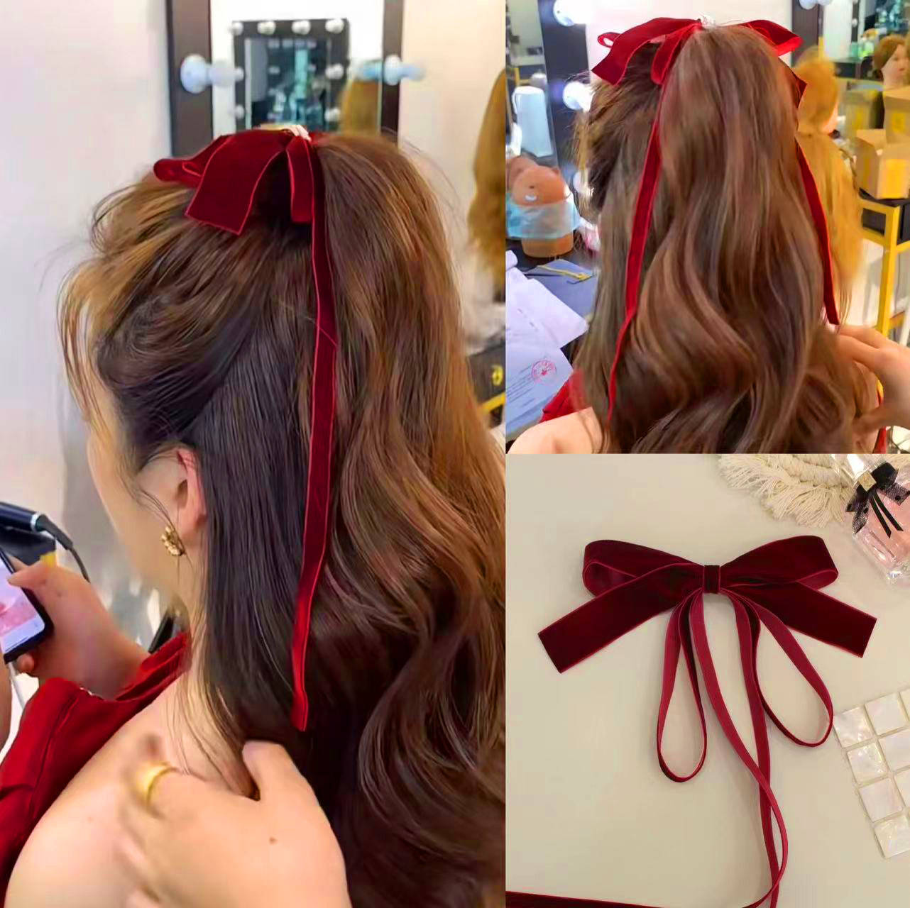 新娘发饰酒红色丝绒蝴蝶结发夹飘带顶夹敬酒服配饰新年复古优雅女