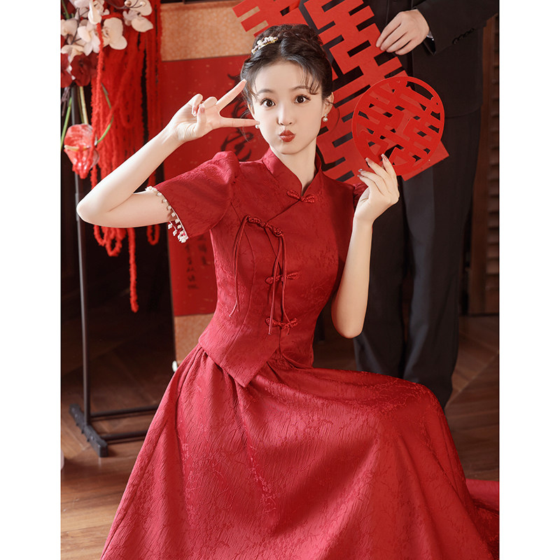 中式旗袍两件式套装新娘敬酒服酒红色订婚结婚礼服裙女2023新款长
