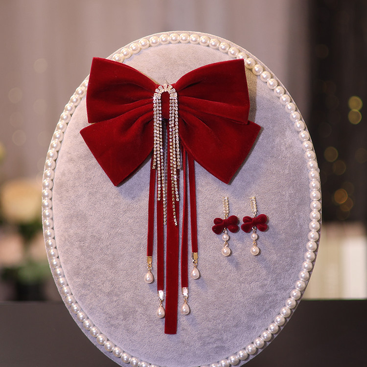 新娘敬酒服头饰中式酒红色蝴蝶结珍珠流苏编发气质宴会礼服发饰品