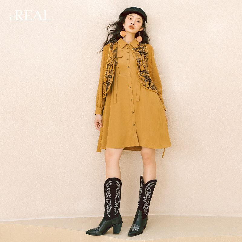 itreal瑞尔秋冬新款女士文艺复古休闲气质风简约棕色连衣裙