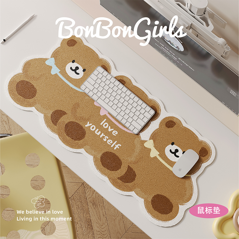 韩系泰迪熊超大鼠标垫女生电脑游戏键盘垫皮革防水防油工位书桌垫