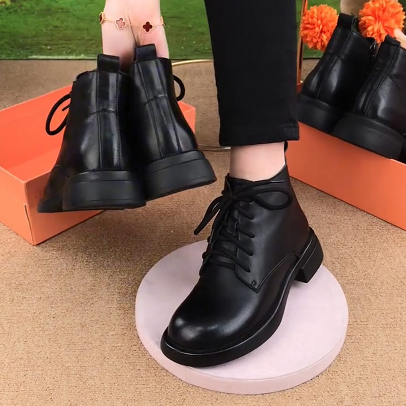 2025秋冬新款高跟短靴女真皮英伦风粗跟系带马丁靴女厚底短筒女靴