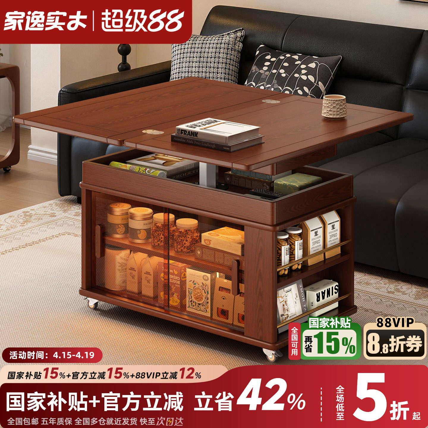 实木升降茶几客厅家用原木带抽屉大板桌可吃饭桌子去客厅化一体桌