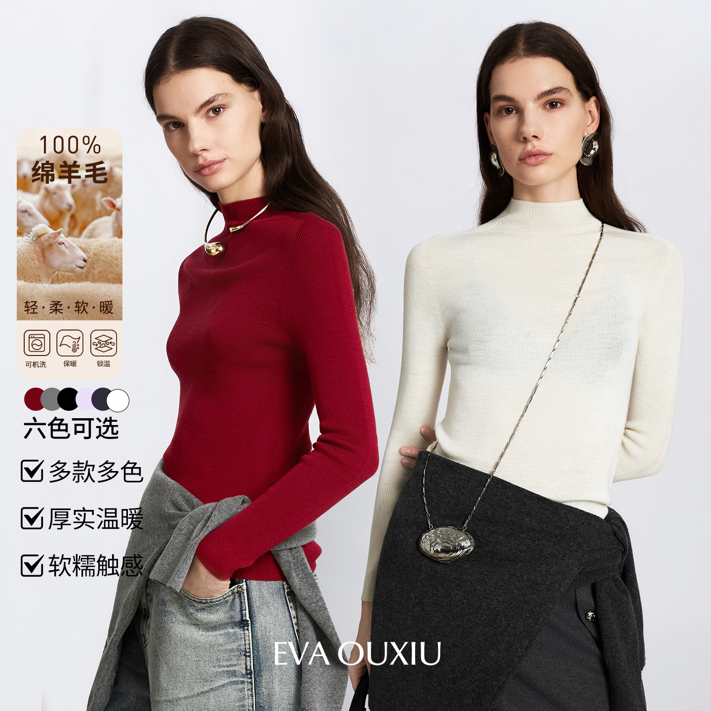 EVAOUXIU【新品】智性半高领针织衫早秋新款100羊毛修身打底毛衣