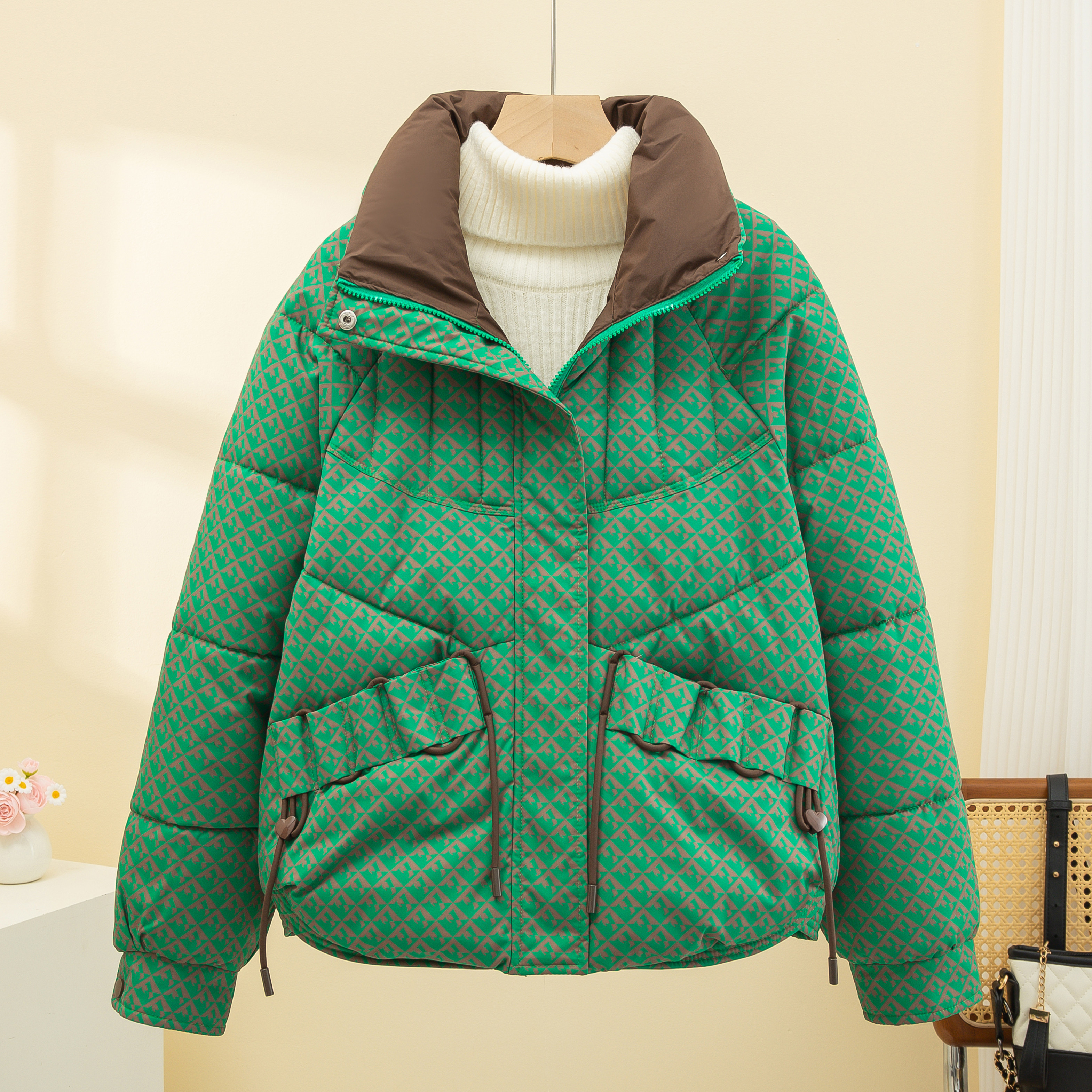 韩版时尚翻领菱格棉服外套女春秋百搭显瘦加厚保暖小个子短款棉衣