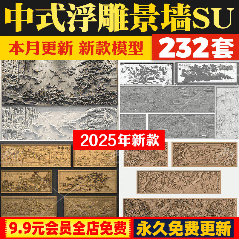 新中式传统文化文字浮雕砖雕雕花图案景墙屏风隔断草图大师SU模型