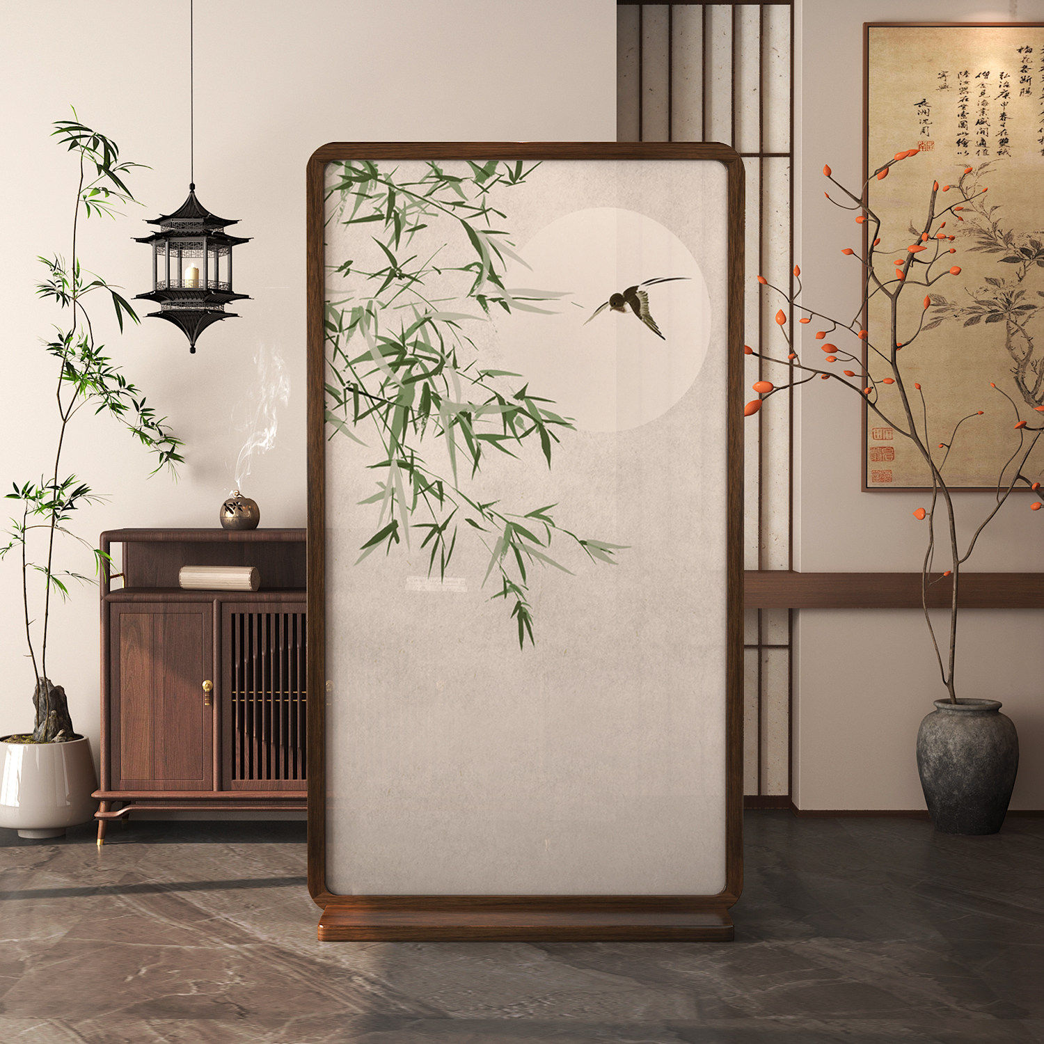 中式宋代美学实木屏风隔断客厅折屏移动办公室遮挡乔其纱专业定制