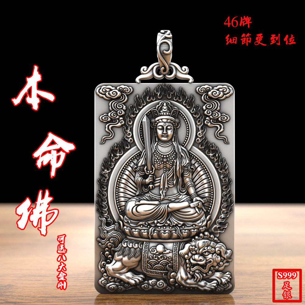 999纯银实心普贤文殊本命佛属龙蛇吊坠男项链足银 生肖守护神银牌
