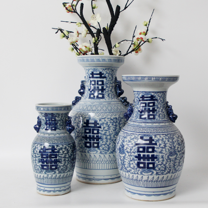 手绘喜字陶瓷花器青花瓷中式家居客厅大花瓶富贵竹插花装饰品摆件