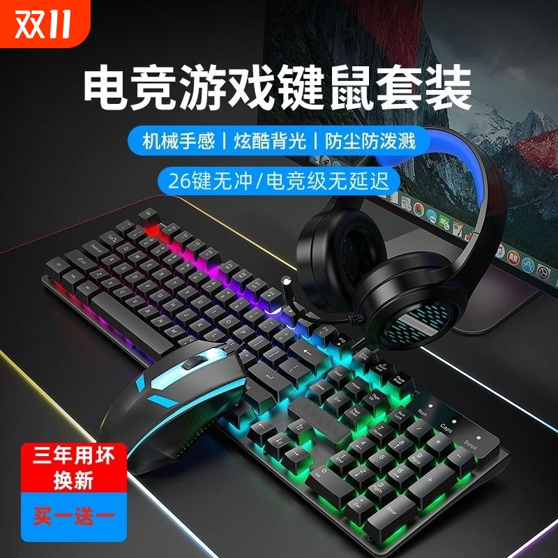键盘鼠标套装有线耳机三件套台式机电脑键鼠电竞游戏专用机械外设