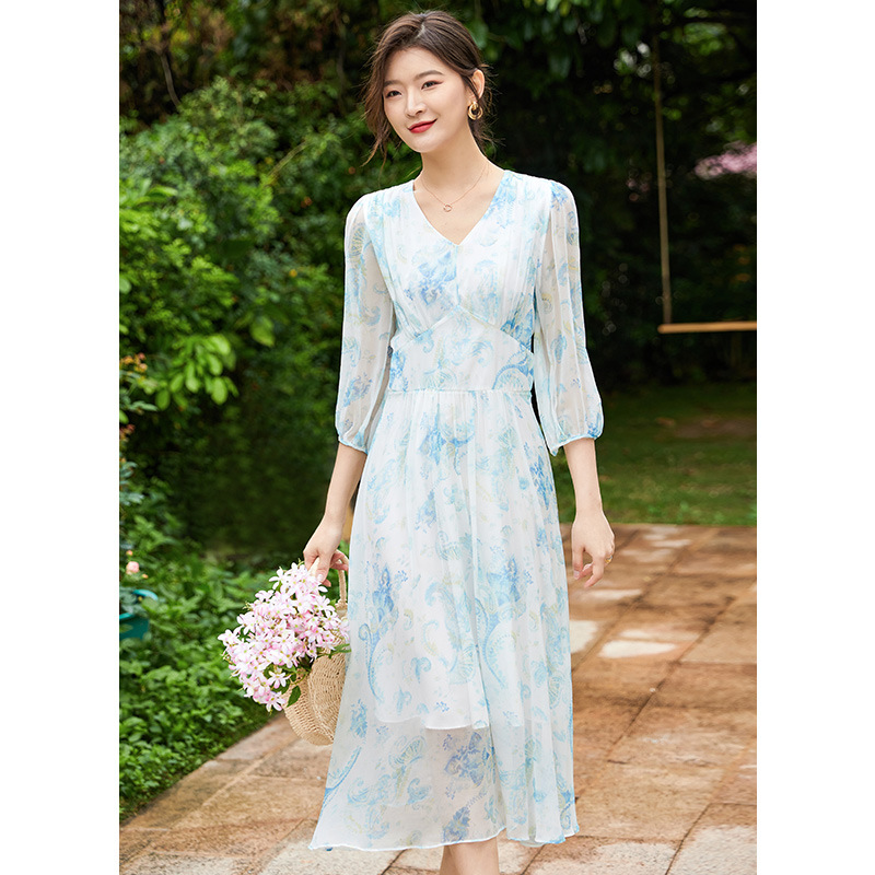 度假风真丝印花连衣裙女高腰显瘦桑蚕丝优雅气质长裙2024夏季新款